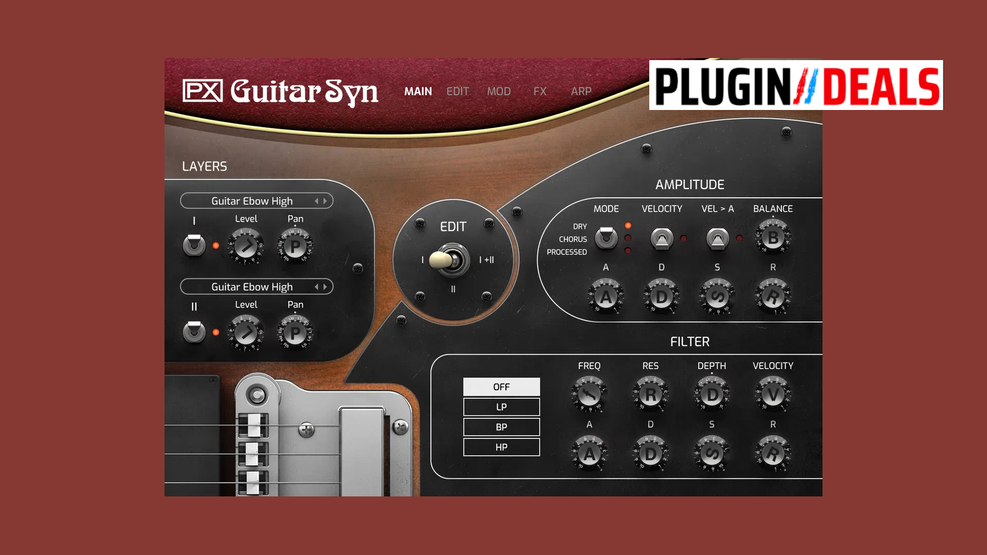 PX Guitar Syn is a virtual guitar synth virtual instrument for UVI Free Player and Falcon 3 Synthesizer. It is inspired by the Roland GS and GR-500 guitar synthesizers.